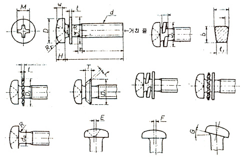 나사의 호칭(d) M2 M2.5 M3×0.5 (M3.5) 작은나사본체 D 3.5 0 4.5 0 5.5 0 6 0 -0.4 0.4 -0.5 -0.5 H 1.3 ±0.1 1.7 ±0.1 2 ±0.15 2.3 ±0.15 R₁(약) 4.5 6 7 8 R₂(약) 0.6 0.8 1.0 1.1 십자홈 십자홈